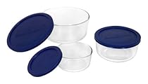 Durable and nice-looking, Pyrex Storage pieces offer a welcome alternative to a cupboard full of plasticware. Made from strong, clear glass, the dishes are great for leftovers, ingredients, or prepared food. They store comfortably in the fridge, warm up in the microwave, and look a lot better than beat-up old plastic pieces at the table. For the storage line, Pyrex combines dark blue plastic lids with its reliable glass construction, adding versatility and stackability to the design. This 6-piece set includes three round dishes--2 cups, 4 cups, and 7 cups--and matching lids. Rectangular pieces are also available, and all are safe in the dishwasher for easy cleanup. --Emily Bedard
