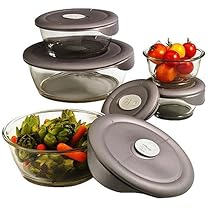 Reheating leftovers is a snap when you own this 10-pc. deluxe Pyrex storage set with vented covers. Just pop your container into the microwave, and don't worry about using wax paper or extra plates. Clear glass containers don't warp, stain or absorb odors and may be used in refrigerator, oven and microwave. Easy-grip, tight-fitting lids seal in freshness and may be used in refrigerator and microwave. Ten pieces include two 1-2/3-cup round bowls, two 5-cup round bowls and one 3-qt. round bowl-all with pearl gray vented plastic covers. Made in USA.