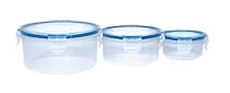 Compact and durable, this 6pc nested Lock & Lock set is ideal for storing food and supplies. Meeting FDA standards these plastic containers keep food and liquids fresh. Made of high grade polypropylene plastic, the containers have a patented ergonomic design that is easy care and easy to use. 100% air and water tight. Dishwasher, microwave, freezer safe. Set includes: One - 3oz/0.37-cup container with lid. Measures: 2.9" round x 1.7" tall One - 1.2-cup container with lid. Measures 4" round x 2.2" tall One - 2.5-cup container with lid. Measures 5.1" round x 2.7" tall